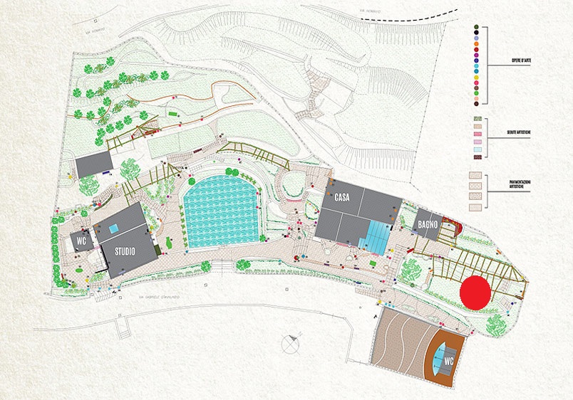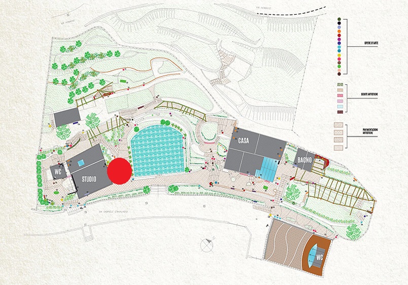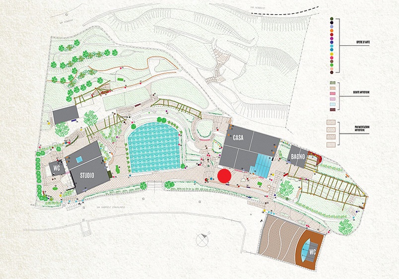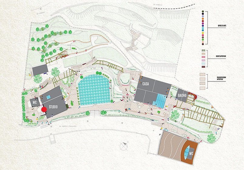 Il parco, muretti, pavimentazioni, un patchwork di ceramiche...